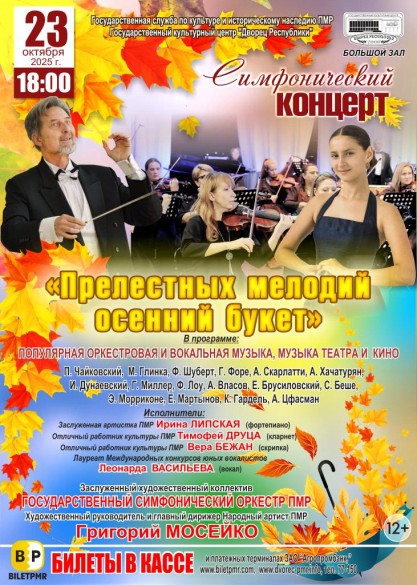 Программа концерта ГСО ПМР 23 октября 2025 года носит название "ПРЕЛЕСТНЫХ МЕЛОДИЙ ОСЕННИЙ БУКЕТ" .