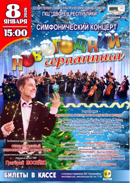Государственный Симфонический оркестр приглашает вас на традиционный новогодний концерт «Новогодний серпантин», который пройдет 8 января 15.00 в Большом зале Дворца Республики. Это событие станет настоящим музыкальным праздником, который подарит всем зрителям атмосферу волшебства и радости в преддверии Нового года!