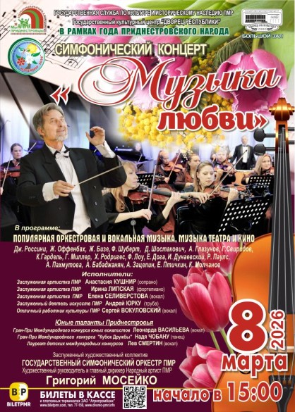 Название концерта "Музыка любви" является настоящим фестивальным брендом Государственного симфонического оркестра ПМР. Оно означает праздничную программу популярной оркестровой музыки, которая исполняется ежегодно в день 8 марта, в рамках Международного фестиваля искусств в Приднестровье "Мэрцишор".