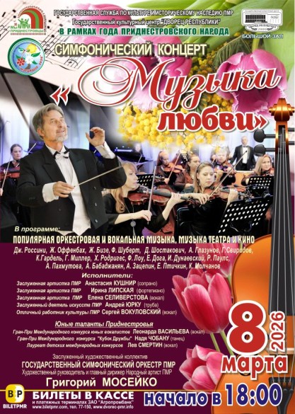 Название концерта "Музыка любви" является настоящим фестивальным брендом Государственного симфонического оркестра ПМР. Оно означает праздничную программу популярной оркестровой музыки, которая исполняется ежегодно в день 8 марта, в рамках Международного фестиваля искусств в Приднестровье "Мэрцишор".