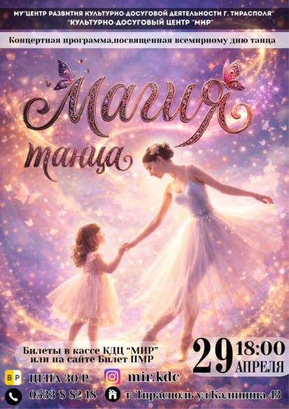 Вас ждёт яркое шоу, море музыки и весеннего настроения. В этот вечер на сцене КДЦ «Мир» оживут самые разные ритмы — от классики до современных танцев. Наши артисты подарят вам настоящий праздник красоты, грации и вдохновения.