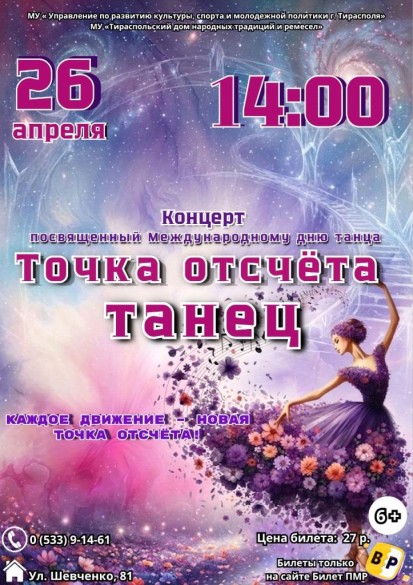 26 апреля в 14:00 в Тираспольском доме народных традиций и ремесел состоится концерт «Точка отсчёта – танец», посвященный Международному дню танца.