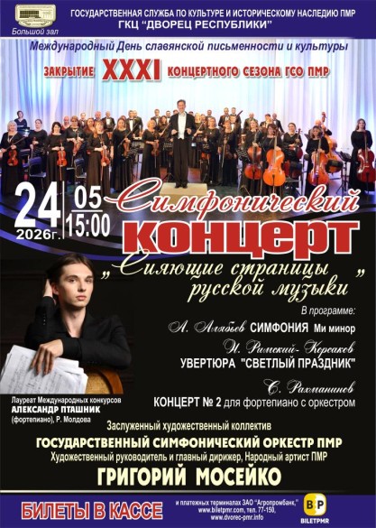 24 мая в Большом зале состоится концерт «Сияющие страницы русской музыки», Государственного Симфонического оркестра с участием зарубежного гостья – Лауреата Международных конкурсов Александра Пташник (фортепиано) Р. Молдова.
