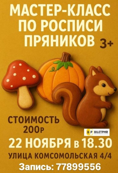 Участники познакомятся с основами работы с глазурью, научатся создавать объёмные элементы и распишут собственные пряники в виде лесных персонажей: белочки, тыквы и мухомора.