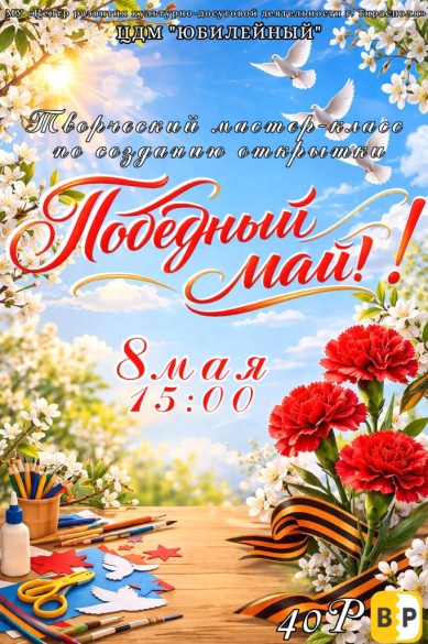 Приглашаем детей на творческий мастер-класс, который состоится 8 мая, в 15:00 в Центре досуга молодёжи «Юбилейный»! В преддверии 9 мая пройдёт мастер-класс «Победный май», где ребята смогут своими руками создать красивую открытку ко Дню Победы! Это отличная возможность проявить фантазию, развить творческие навыки и сделать памятный подарок своими руками. Стоимость билета: 40 руб. Ждём вас на тёплом и вдохновляющем мероприятии!