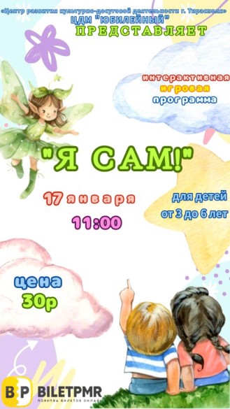Дорогие друзья! ЦДМ «Юбилейный» приглашает малышей и их родителей на яркую интерактивную игровую программу «Я САМ!», которая состоится 17 ноября в 11:00. Добрая Фея Искорка вместе с героями познакомит детей с такими важными понятиями как дружба, искренность и честность. В увлекательной игровой форме ребята будут: Рукодельничать и создавать поделки, развивая фантазию и моторику! Танцевать и веселиться вместе с героями! Открывать в себе творческие способности! Программа рассчитана на детей от 3 до 6 лет и станет не только праздником, но и полезным опытом, который подарит малышам уверенность и радость, а родителям — тёплые воспоминания. Стоимость билета: 30 руб.