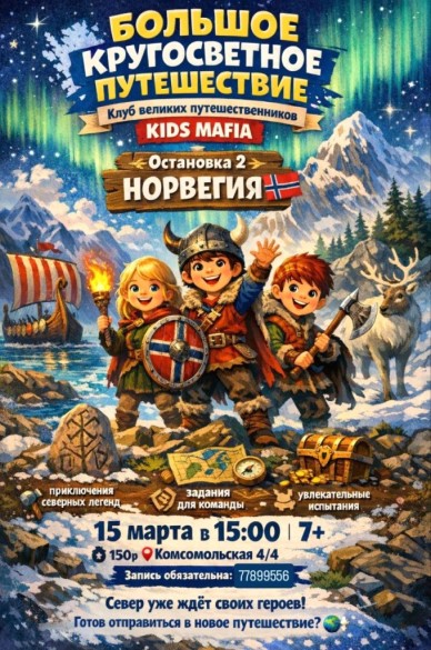 Юных исследователей ждёт погружение в атмосферу северных легенд, мир викингов и загадочное сияние Севера. Это не просто мероприятие — это настоящее приключение, где дети становятся частью команды путешественников, выполняют миссии и проходят увлекательные испытания.