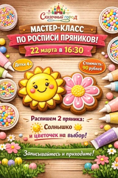 22 марта в 16:30 в "Сказочном городе" пройдет весёлый мастер-класс по росписи пряников для детей 4+.