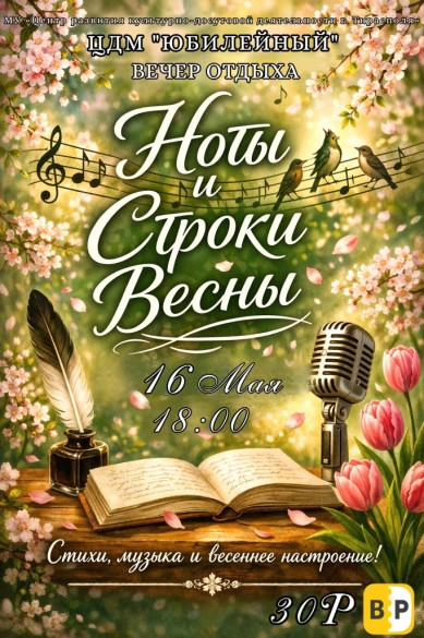 16 мая в 18:00 ЦДМ «Юбилейный» приглашает на атмосферный вечер «Ноты и строки весны». В программе — музыка, стихи и живые выступления, которые создадут тёплое весеннее настроение! Это отличный повод отвлечься от повседневной суеты, вдохновиться и провести вечер в уютной творческой атмосфере. Стоимости билета: 30 рублей Приходите за эмоциями, которые остаются надолго!
