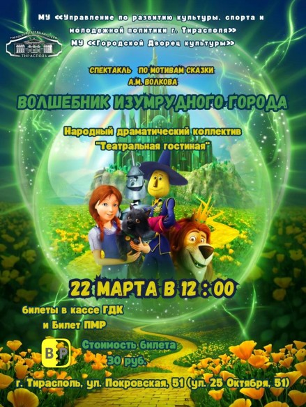 22 марта на сцене Городской Дворец культуры оживёт удивительная история по мотивам сказки Волшебник Изумрудного города писателя Александра Волкова.